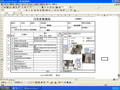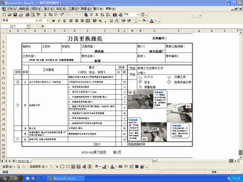 如何合理的规范换刀,这是减少加工首件出现废品的保障手段之一。机加工自动线的换刀工作是生产线操作工必须做的工作内容之一。机加工线的刀具有些已有刀具管理部门调整完成,送到线旁;有些需有操作工直接调换刀片完成刀具更新,但这些均需有操作工完成新旧刀具的更换和工件试切。在这一试切首件前的最后一个环节中,操作工调刀时,一般刀具的固定安装没问题,但相关的细微工作往往不被引起注意,故常常会出现安全事故、刀具损坏、加工首件不合格或产生批量报废等等。这其中有一部分是刀具部门本身的调整刀具质量不符要求,但也有一部分属于操作工调刀不规范所致,故操作工需要按一定的规范调整调换刀具。根据实际生产情况,我们在刀具的调刀前、调刀中、调刀后三个部分均做了符合现场的安全、设备、加工要求的规范标准。如下图为我厂V6缸体线OP30-8L工位的刀具更换规范文件。