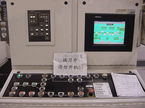 调刀时,操作工必须先在主控制台上放上“换刀中,请勿开机”的提示牌子(下图),才可进行调刀的工作内容,避免别人不知情的情况下开动机床,造成不安全因素产生。调换刀具时,操作工需根据不同的刀具,双手必须戴上不同的手套来调换刀具,这样可防止调刀中手被划破的风险。有些机床内部调刀位置狭小,调刀中操作工还必须戴上安全帽,预防调刀中头部碰到机床内的尖角。