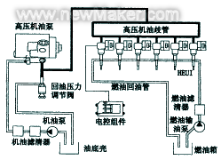 柴油机电控喷油系统主要有两种形式[7]:共轨式和泵喷嘴式。共轨式喷油系统具有高度的灵活性,能够在各种工况下自由选定喷射压力,并且可以在很大程度上自由确定预喷射、主喷射和后喷射参数,是小型车用发动机的理想选择。其代表是德国的卡特匹勒(Caterpillar)公司、日本的电装(Nippondenso)公司、德国的罗伯特.波许(Robert Bosch)公司等开发的小型车用柴油机电控喷油系统。高压泵喷嘴式喷油系统可以自由调节喷射定时,喷射压力高,但是对于转速有较大的依赖,适合与较大型的柴油机匹配。其代表是英国的卢卡斯(Lucas)公司载重车用柴油机喷油系统,美国GE公司开发的机车柴油机电控喷油系统等。各公司的电控喷油系统的形式虽然不同,但其基本构成大致相同。卡特匹勒公司的HEUI系统原理图如图1所示。柴油机电控喷油系统的结构主要包括:油泵(含燃油泵和机油泵)、喷油器(含增压装置)、油管及附属装置(含滤清器、油轨等必备部件)、高速开关阀和电控组件等。