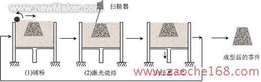 快速成型的基本原理是离散叠加制造,一个零件不管其外形和内腔是多么复杂,都可以用一组平行平面去截该零件,得到一系列足够薄的切片,这些薄切片可以近似的看作二维零件模型,用不同的使能技术将这些薄切片逐层制作,同时使这些薄片按照一定的规则堆积起来就可以得到一个完整的零件。目前成熟的快速成型技术有很多,这里仅介绍最适于发动机部件制作的选区激光烧结(简称SLS)方法。