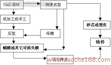 快速铸造的工艺流程如图2所示,利用选区激光烧结实现快速铸造的途径有二条:一个是通过激光直接烧结铸造用热固化树脂砂,再通过砂型铸造得到铸件;另一种方法是用激光直接烧结可消失的树脂粉末或蜡粉,再通过精密铸造工艺得到铸件。这两种方法的共同特点都是省略了模具制造。因此,如果用于单件或小批量的生产,生产周期大大缩短了。
