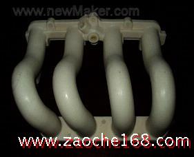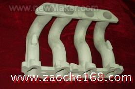 采用熔模快速铸造的方法是用50-80μm的可消失树脂粉末或蜡粉为原料,将零件的三维CAD毛坯模型直接进行分层处理后,用激光将粉末直接逐层烧结成与零件毛坯一致的精密熔模,再将熔模直接通过石膏型或陶瓷型壳铸造得到所需要的铸件。采用快速精密铸造制作的零件表面质量好,精度高,不需要设计砂型模型等步骤,工艺过程相对简单。同时由于零件毛坯的体积往往小于砂型的体积,因此用SLS直接成型熔模较之成型砂型速度更快,成本相对更低。但是熔模铸造一般比较适合于薄壁零件,对于厚壁零件往往因冷却速度慢导致出现缩松等铸造缺陷,因此这种方法在发动机部件的制作中一般用于进排气管等相对壁厚较薄的零件,图4是用可消失树脂粉直接烧结成型的发动机进气管的铸造熔模。