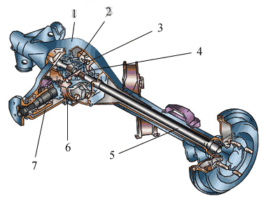 1-后桥壳;2-差速器壳;3-差速器行星齿轮;4-差速器半轴齿轮;5-半轴; 6-主减速器从动齿轮齿圈;7-主减速器主动小齿轮