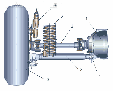 1-主减速器;2-半轴;3-弹性元件;4-减振器;5-车轮;6-摆臂;7-摆臂轴