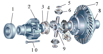 1-轴承;2-左外壳;3-垫片;4-半轴齿轮;5-垫圈;6-行星齿轮; 7-从动齿轮;8-右外壳;9-十字轴;10-螺栓