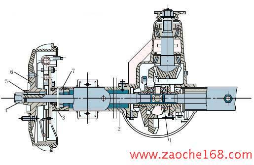 1-止推块;2-半轴;3-圆锥滚子轴承;4-锁紧螺母;5-键;6-轮毂;7-桥壳凸缘