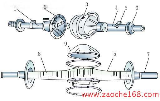 1、4-半轴壳 2-左桥壳 3-右桥壳 5-钢板弹簧座 6-突缘 7-半轴套管 8-后桥壳 9-壳盖
