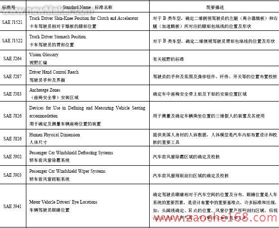 在进行汽车内部布置时,SAE 中有如下用于驾驶员和乘员的人体工程学研究和设计的相关标准。