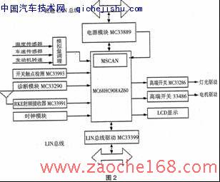 中央控制器的核心单元采用的是freescale的Mc68HC08AZ60,该芯片内部带有60K的flash mem-ory ;2K的RAM,1K的eeprom用于系统保存故障信息并且有SPI模块和外围的智能芯片通讯,增强的SCI模块实现LIN总线通讯和8位的A/D模块,CAN控制器和定时器单元。中央控制器的硬件结构示意图如图2 。