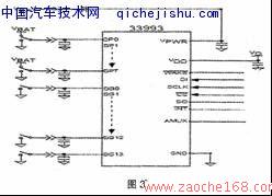 系统需要采集的输入量包括脉冲量、开关量和模拟量。开关量包括组合灯光开关,前雨刷开关,洗涤泵开关,车内灯开关和起动钥匙等大量的开关信号,为了节约系统资源,采用了MC33993触点监测模块来扩展系统的I/O口,MC33993具有22路输入,其中8路可以配置成接地或者接电源,其余14路为接地开关监测,通过SPI与微控制器通讯,并且可以开关电平跳变触发中断唤醒,因为是接地检测,无需采用光电隔离,极大的节约了资源,增强了系统的EMC性能。如图3