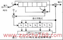 图2中,I端输入信息码元,P端输入校验码元。解码器把接收到的R(D)中的每一段信息元送入编码器中求出本地检验元,与其后面收到的检验元模2加。若两者一致,则求出的伴随式分量si为0,否则为1。把加得的值送入伴随式寄存器中寄存。当接收完7个码段后开始对第 0码段纠错,若此时大数逻辑门的输出为1,则说明第0码 段的信息元有错。这时正好第0子组的信息元移至解码器的输出端,从而纠正他们。同时,纠错信号也反馈至伴随式 寄存器修正伴随式,以消去此错误对伴随式的影响。如果大数判决门没有输出,则说明第0子组的信息元没有错误,这时从编码器中直接把信息元输出 。