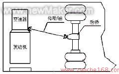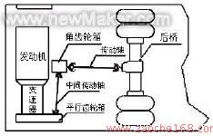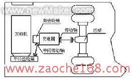 3) 在变速器后装平行齿轮箱,动力通过中间传动轴传递到独立的角齿轮箱,再通过传动轴输出到后桥,如图3a 所示。一汽客车底盘厂试制过这种结构的样车;日本中型客车大部分也采用这一动力传递路线,如图3b 所示。
