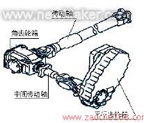 4) 在发动机离合器后装平行齿轮箱,动力通过中间传动轴传到装在变速器输入轴的角齿轮箱再到变速器(变速器纵向布置),然后通过传动轴到后桥。如图4 所示。
