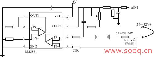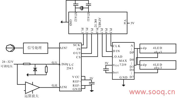 电源信号的测量包括采集电路和显示模块两部分,装置电路图如图2所示。检测供电电源的电压采用分压电路实现,小电阻4.3KΩ两端接上一个5.6V稳压管以保护单片机系统;检测工作电流应用运算放大器LM358将采样电压放大为标准信号,如图3所示。然后将电压、电流检测电路输出接入TLC2543的AIN0,AIN1接口,完成对电源信号的采集。显示模块由2个四位一体的共阴极数码管和1片LED串行共阴极驱动器MAX7219构成。MAX7219的3根控制线DIN, LOAD, CLK与单片机AT89C52的P1.5~P1.7相连,数码管的段选信号线a-dp分别和MAX7219对应的SegA~SegDP相连,其中一组数码管LED1的4根位选信号线和MAX7219的位驱动线Dig0~Dig3相连接,另一组LED2的位选信号与Dig4~Dig7相连。LED1显示系统供电电压,LED2显示工作电流。固件程序分为信号采集和数据显示两部分,系统工作是在程序控制下,完成对模拟信号的采集和电源信号的显示。