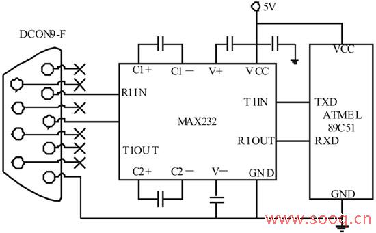 由于RS-232串行通信标准接口使用方便、接线少而且传输距离可达到15m,足以满足监测系统的技术要求,因此选用RS-232的串口通信方式。ATMEL的89C52单片机通过普通I/O口与 PC机 RS-232串口实现通信的硬件接口电路,如图4所示。由于 PC系列微机串行口为RS-232标准接口,与输入、输出均为TTL电平的AT89C52单片机在接口规范上不一致,因此TTL电平到RS-232接口电平的转换采用 MAX232标准 RS-232接口芯片,该芯片可以用单电压(+5 v)实现RS-232接口逻辑“1”(-15~3V)和逻辑“0”(3~15 v)的电平转换。AT89C52的P3.0为串行输入端,P3.1为串行输出端。