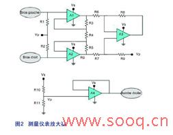 这个测量仪表放大器包含有两个级。最后一个级(亦即输出级)是一个差分放大器,它能够拒绝直流电平以及同时影响两个输入的干扰和噪声电压源。由两个放大器组成的第一级(亦即是输入级)则被配置成一个可将输入隔离的缓冲器。可是,基于放大器间的失配使它们彼此不能相互连接,所以要在两个放大器之间加装平衡电阻。将两个级的增益相乘便可得出测量仪表放大器的增益。理论上,共模抑制比(CMPR)应该是无限大,但由于出现电阻失配,导致输出级的非零共模增益非常小。在电路的输入级中,流经所有电阻的电流是一样的。这都有赖于LMP2234具有高输入阻抗和低输入偏置电流的特点。
