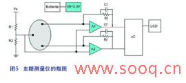 图5所示为一个完整方案的框图,该系统是由电池供电并可使用LM2623来提供3.3V的电源电压。通过电极量度出来的电流之后会经由一个运算放大器被转换成一个电压,这个电压再被送到微控制器处理,最后显示在LCD荧幕上。