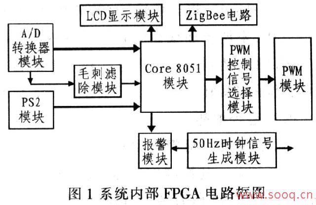 FPGA的设计使用的是ACTEL公司的Libero IDE集成开发环境。FPGA的内部电路由A/D转换模块、PWM模块、10路PWM控制信号选择模块、PS2模块、50 Hz时钟信号产生模块、报警电路模块(FPGA实现)、LCD显示模块和Core805l模块等构成。图1给出系统电路框图。这些硬件模块搭建组成整个控制系统,其中Core 8051模块是整个FPGA内部电路的核心,所有的数据通过8051进行处理并显示。