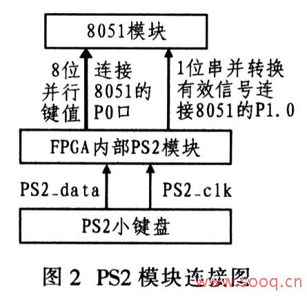 (3)PS2模块根据PS2的通信协议,将输入的串行数据转换为并行数据和一位转换有效的使能信号。将这些信号传输到805l,并运行软件程序处理,实现整个系统的设定数据输入,即各个通道参数的设定。由于高频时钟所产生的有效信号,其脉冲信号非常窄,在硬件电路设计时将这个信号加宽到PS2模块工作时钟周期的12倍,这样在8051程序的执行中,可采集到这个有效信号。PS2模块在系统中的连接如图2所示。