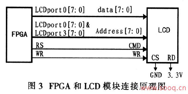 (8)LCD显示模块 系统设计选用640x480点阵的LCD显示屏,用MAX—EPM3128ACT CPLD做成的控制板代替LCD控制器,16个地址口、8个数据口和4个控制口的控制板与外围处理器相连接。因为不需从LCD的屏幕读取数据,4个控制口只用到了命令/数据选择控制信号CMD和写信号WR。在显示中对LCD的操作即是对一个RAM的读写,将显示的点阵信息写入到相应的RAM地址中即可。内部有两块相同的RAM模块,可对不同部分的RAM操作,这样可以增加LCD的刷新频率,显存数据可交替读写,还可以边写边显示。LCD控制器的数据/命令的选择信号就是CMD信号。图3给出LCD接口与FPGA的连接原理图。