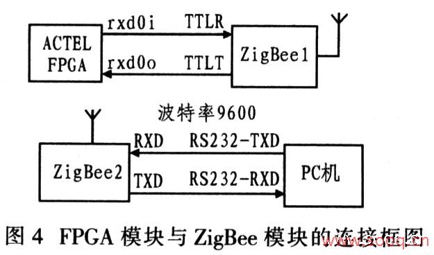 (9)ZigBee无线传输电路选用基于MCl3192射频收发器作为ZigBee无线传输模块。模块内嵌的软件协议支持免碰撞串行通讯的功能,使多点TTL/2RS232/RS485数据流透明的传输,互不影响。从8051的串口输出端发送数据给无线传输模块。在8051串行数据输入端接收发送成功或失败的反馈信号。805l发送和接收的都是TTL电平信号。另一端ZigBee模块直接与PC机的RS232串口相连接,用来接收从8051中发送的数据。图4给出模块间的连接框图。