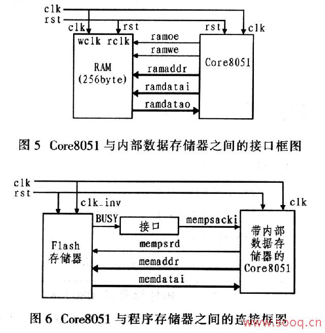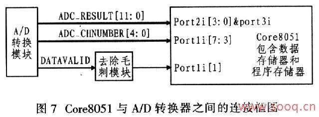 (10)实例化Core8051模块该控制系统的系统软件用805l编程实现,ACTEL公司提供的8051软核是该控制系统的核心,系统设计是直接调用该软核,然后实例化8051软核。软件中温度控制算法采用增量式PID算法编写,实现了高精度的温度控制。图5给出FPGA内部的805l模块与内部存储器之间的接口框图。图6给出Core8051与程序存储器之间的连接框图。图7给出Core8051与A/D转换器之间的连接框图。
