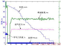 对于传统发动机减速工况,节气门关闭时,进气歧管绝对压力很低,缸内易发生不完全燃烧,结果使发动机排出未燃烧的混合气,这些混合气在催化转化器中继续燃烧,使排气温度更高并可能会损坏三元催化转换器,而且还会导致HC和CO等排放的增加。因此,此时切断燃油的喷射可以增加发动机的制动能力,提高燃油经济性和排放性能,并能够保护催化转换器。下图是传统发动机断油工况参数变化曲线。下图3是断油工况各个参数变化曲线。