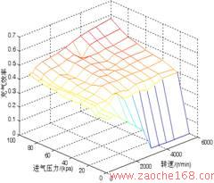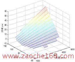台架的试验主要是针对稳态工况点对发动机基本工作参数进行优化,找出控制规律,提供基本的喷油、点火等数据。发动机台架主要标定的项目有,设定初始参数的标定,系统进气温度修正预标定,蓄电池电压修正标定,各缸混合气均匀性标定,基本喷油标定,基本点火提前角标定,大负荷加浓标定,空燃比闭环标定,发动机性能优化试验。图4是发动机充气效率基本脉谱;图6是发动机转速、扭矩、功率脉谱。