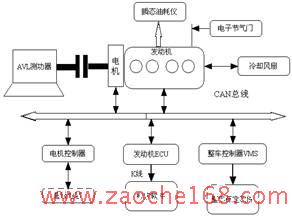(5)自主开发整车电控管理系统,整车控制器负责整车的能量管理和动力分配,通过优化发动机和电机的动力匹配,实现最佳的燃油经济性、排放和动力性的控制。整车控制器负责采集整车各种档位、油门、刹车信号,通过CAN总线对发动机和电机控制器发出控制指令,实现整车各个工况下的优化控制。