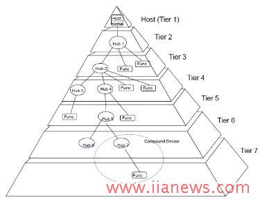USB连接了USB设备和USB主机,USB的物理连接是有层次性的星型结构。每个网络集线器是在星型的中心,每条线段是点点连接。从主机到集线器或其功能部件,或从集线器到集线器或其功能部件,从图中可看出USB的拓扑结构。USB规范规定通过使用Hub扩展可拨接多达127个外设,最多六层,标准USB电缆长度为5m,通过Hub或中继器可以使外设距离达到30m(6*5)。近些年出现一种“USB延长器”技术,通过使用5类线可以将USB延长至100M,这种技术扩展了USB测量系统的灵活性,但对于要求高速和准确的测量系统来说该技术需要进一步检验,并没有包含在规范中。