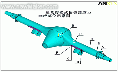 本桥壳的G、H点即是平衡杆座板焊接位的应力集中问题, E点处在中间相对水平缓的过度部位,该处往往开大伞齿轮安装切槽或法篮螺孔,应力响应也较高,A、B点的高应力响应对应最大侧向载荷工作情况发生。