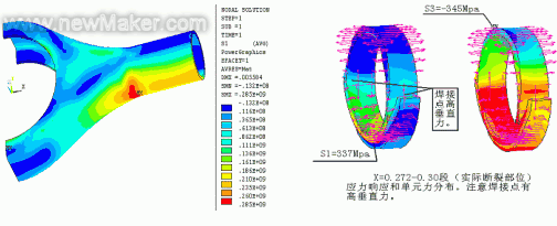 分析表明,桥壳的高应力响应点在平衡杆加强板和桥壳焊接结缝,该点非常接近桥壳对焊焊缝与琵琶段阔涨段的三角接板对焊位。从桥壳敏感部位局部的计算结果中,可见该段基本上是弯曲工作状态。焊点位存在较大的连接力,在桥壳焊缝同一部位的高应力响应。