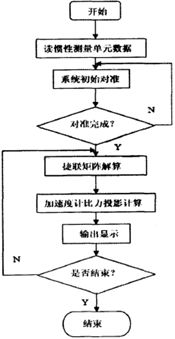 惯性测量单元通过数据采集卡采集的数据进入计算机的程序流程图如图3所示,首先从数据采集卡读入惯性测量单元采集的数据,进行初始对准、解算捷联矩阵初值,然后进行捷联矩阵更新,得到地理坐标系相对于惯性坐标系的旋转角度,考虑到陀螺的角速度输出,就可以计算出载体坐标系和地理坐标系之间的方向余弦矩阵。通过这个方向余弦矩阵的分解,便可以将加速度计的输出变为载体沿地理坐标系的加速度分量。然后,利用加速度的一般表达式,对有害加速度进行补偿,就得到载体沿地面的运动加速度;将其积分,就得到南北向、东西向的地速分量Va、Ve。有了地速分量,经过相应的变换,就得到经纬度的变化率;再对其积分,最终就得到载体瞬时位置的经度和纬度。再利用姿态矩阵的元素,提取姿态和方向信息。