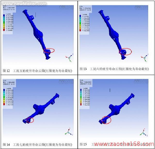 我们通过以上诸表和图形对静力状态下的四种工况有了很直观的了解,现在我们对工况五~工况八的疲劳做一下分析比较,由于没有获得材料本身的疲劳寿命曲线,本次计算只是利用软件本身所带材料疲劳曲线进行了计算对比。
