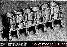 气缸工作表面、冷却液通道、曲轴主轴承连同其螺纹连接处以及气缸盖螺纹连接处做成一个单独的零件——所谓的镶嵌件(见图2)这个镶嵌件由过共晶铝合金制成在压铸过程中用镁合金浇铸在它的周围。在此过程中以组合的方式形成了曲轴箱毛坯。为了实现这一目标不得不将曲轴箱做成开式顶板结构这是又一个结构特点。