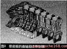底板同样做成组合件,而且也是压铸件(见图4)。为了承受主轴承的力采用了钢粉末冶金的镶嵌件结构的其余部分还是用镁合金制成的。底板与曲轴箱上体之间通过螺栓连接。