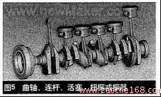 利用刚性良好的底板结构,即使在的发动机中也可以采用由GGG70制成的球墨铸铁曲轴,而不必以增加噪声作为交换条件(见图5)。此外还对曲轴的尺寸进行了优化,这导致了56mm的主轴承直径和50mm的连杆轴承直径。一靠近变速器的最后一档主轴承做成65mm,这提高了曲轴后端的刚度,并防止飞轮抖动。结构设计的优化给予了曲轴以较高的抗扭刚度,还能明显地减小单个曲拐的不平衡度。由此,与制造工艺方法相结合产生了一种非常轻巧的、刚性良好的曲轴,这样的曲轴因为减小了主轴承直径而与其原型发动机相比减小了摩擦力矩。连杆做成了梯形连杆,以减小作往复运动的质量。连杆大头采用了涨断工艺通过相应的几何形状设计而可以来用M8的螺栓连接,尽管断油转速设置得相当高。