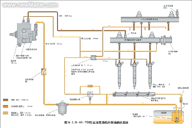 喷油压力提高到了1600bar(1bar =100kPa),比以前的第二代共轨系统提高了250bar。新款奥迪A6L 3.0I-V6-TDI型柴油发动机的燃油供给系统采用了Bosch(博世)公司的第3代共轨技术,如图14所示。该系统配有一个由齿形皮带驱动的高压泵,左、右气缸座各有一条分配管。