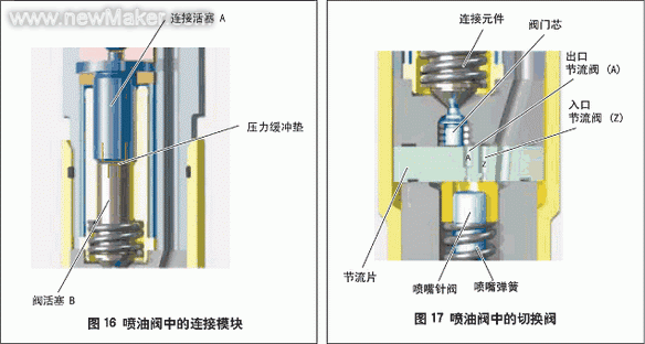 喷油阀中的切换阀(如图17所示)由阀门板、阀门芯、阀门弹簧和节流片组成。燃油经节流片上的入口节流阀(Z)流到喷嘴针阀处并进入该针阀上部的腔内,于是喷嘴针阀的上部和下部压力就平衡了,喷嘴针阀就被喷嘴弹簧的作用力保持在关闭的位置上。当压下阀门芯时,回流通路就打开了,轨内的压力油首先流过喷嘴针阀上部的一个较大的出口节流阀(A),于是喷嘴针阀就被该压力抬离针阀座,然后就开始喷油。