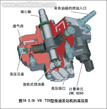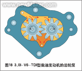 齿轮泵(如图18所示)由齿形皮带通过高压泵的贯穿偏心轴来驱动,将油箱中的燃油(用油箱内的泵)输送到高压泵中。