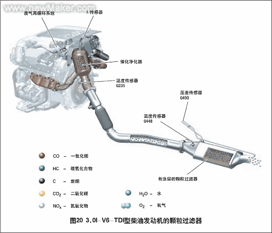 3.0I-V6-TDI型柴油发动机使用了无催化净化添加剂的颗粒过滤器(如图20所示)。这个所谓的“催化炭烟过滤器”(CSF)有一个含有贵金属的过滤层。为了能还原过滤器和监控排放系统,需要安装多个传感器:3个温度传感器和1个压差传感器。温度传感器分别安装在涡轮增压器前方、催化净化器后方和颗粒过滤器前方。压差传感器用于监控颗粒过滤器前、后的压力差,还可识别出过滤器是否被炭烟堵塞。