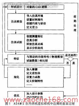 为满足现代汽车内燃机工业的发展需要,必须对传统的以经验加试验的设计方法进行改进。汽车内燃机作为整车研发中技术含量最高、最核心的技术,开发目标的要求和难度越来越高。近年来,虚拟样机技术在内燃机领域获得了越来越广泛的应用。ADAMS(Automatic Dynamic Analysisof Mechanical System)是美国MDI公司(2002年被MSC收购)研制的集建模、求解、可视化技术于一体的虚拟样机专业软件。现在世界上主要汽车制造商都在应用ADAMS数字化虚拟样机软件,它可仿真任何运动系统。ADAMS虚拟样机技术的基本应用过程如图1所示。本文初步实现其中的前期处理部分,通过建立内燃机的虚拟样机模型,利用ADAMS软件对其进行了动力学仿真分析,仿真结果与客观实际相符。本文应用虚拟样机技术对内燃机模型进行动力学仿真,为汽车内燃机的设计提供了新思路。