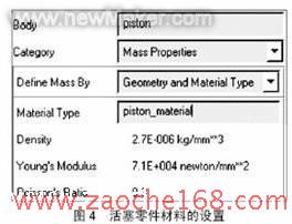 本文创建活塞零件材料为铝合金,其密度和弹性模量设置如图4所示,同理给连杆、曲轴、气阀和凸轮轴设置材料属性。使用ADAMS/View中的约束库在零件之间创建约束副(Constraint),以确定零件之间的连接情况以及零件之间是如何相对运动的。