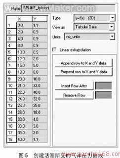 载荷的施加包括定义气缸对活塞的压力、气阀杆顶端和气缸盖之间的弹簧力、凸轮和气阀之间加入面-面接触力、重力加速度。其中,根据气缸内流体动力学数值仿真结果,利用一个工作循环内的缸内压强数据,可以得到气缸内压强曲线(DataSpline)SPLINE_fpiston,如图5所示。图中自变量X表示时间(单位为毫秒),因变量Y表示气缸内气体压强(单位为105帕)。活塞所受的总的气体平均压力为活塞上、下两侧空间内的气体压强差与活塞截面积的乘积。在ADAMS中燃气压力采用Spline函数进行曲线定义,采用AKISPL函数式进行表达。