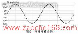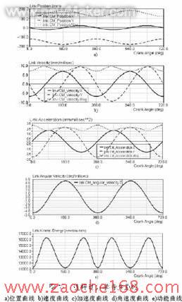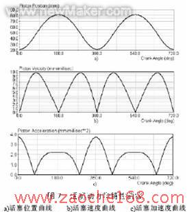 创建完成虚拟样机系统模型后,可用ADAMS/View中的Simulation/Controls对发动机主运动系统进行动力学仿真。仿真时ADAMS/View调用ADAMS/Solver进行求解。在仿真开始前,ADAMS/Solver根据模型的自由度判断是进行运动学仿真还是动力学仿真。如果整个模型的自由度为0,则进行运动学仿真;如果整个模型的自由度为1或者大于1,则进行动力学仿真。ADAMS提供了ADAMS/PostProcessor以提高ADAMS仿真结果的处理能力。仿真结束后可以得到模型的所有测量参数及ADAMS预设的动力学参数的变化曲线。如图7至图11所示,在曲轴以3000rpm保持匀速时,活塞和连杆的动力学特性曲线完全符合平衡状态下的物理规律。活塞速度峰值约为9.8m/s,加速度出现两个峰值,分别约为3700m/s2和2250m/s2;活塞所受合力的变化范围大致是-170000N~4000N;连杆的摆角峰值为±15°,呈正弦曲线变化;当气缸工作在燃烧阶段出现尖峰压力时,内燃机的输出指示转矩也达到最大,最大值约为180Nm,并在其他时刻有小幅波动。可以非常直观地看出,活塞的加速度曲线及其往复惯性力曲线、连杆摆角曲线及其动力学特性曲线都是呈周期性变化的。仿真分析结果可以作为发动机进一步性能优化设计的依据。