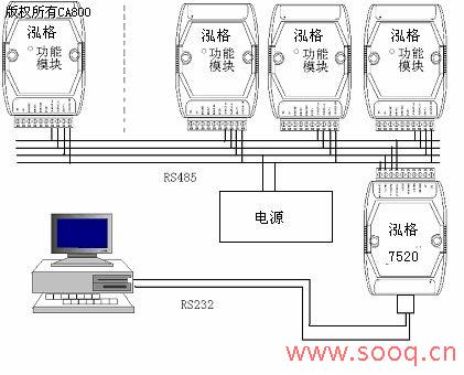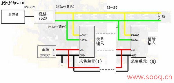 将各个计量点的数据采集模块统一挂在地址总线的网络上,设置成不同的地址,通过RS458/RS232 通信转换模块,将采集的数据传至计算机。计量监控室内,模块和单机的接线连接方式和连接原理见下图