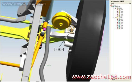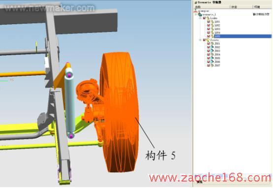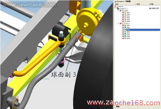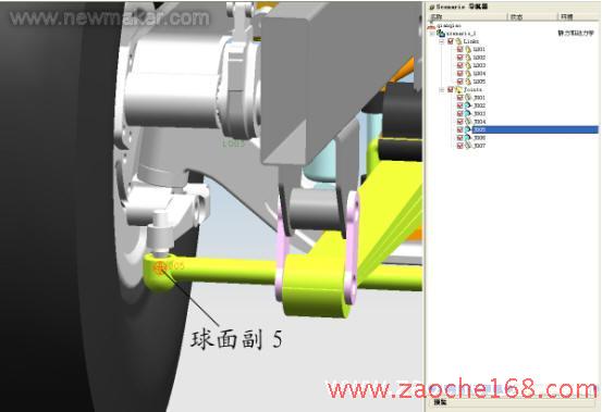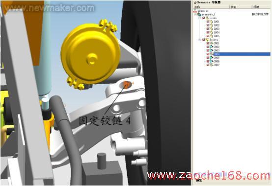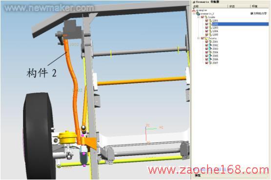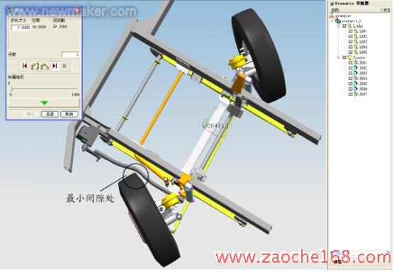分析时单击 单步向前、单步向后 按钮,对轮转向进行动态的观察。通过观察可以检查出车轮作转向运动时相关部件间有无运动干涉情况、运动中各部件的间隙是否足够。根据检查结果来调整布置方案或重做部件设计。根据以上分析确定了前减震器的安装位置。
