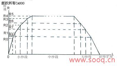 细纱机专用变频器除能按设定的纺纱曲线调速(如图3所示)外,还要求变频器效率高、温升低。效率的提高主要靠降低功率器件的开关损耗,而温升的降低,一是可以增加散热面积,这样变频器的体积增大;二是可以采用水冷散热,这样能有效的降低变频器的温升,但要增加一套水冷循环系统。另外,因细纱机车间飞花(超短纤维)多,控制拒拟制成密封式,不利于电气元件散热,因此,变频器安装结构形式应有所不同,如将散热器置于拒外或其它安装方式。