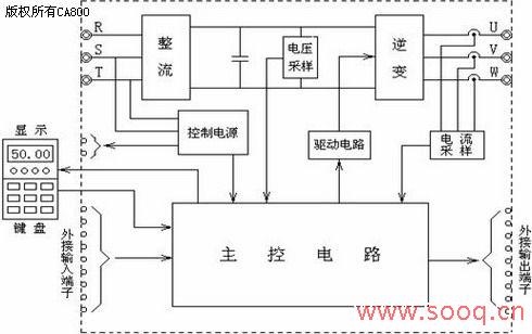 变频器是利用电力半导体器件的通断作用将工频电源变换为另一频率的电能控制装置。低压变频器主要采用交—直—交方式,先把工频交流电源通过整流器转换成直流电源,然后再把直流电源转换成频率、电压均可控制的交流电源以供给电动机。变频器的电路一般由整流、中间直流环节、逆变和控制4个部分组成。整流部分为三相桥式不可控整流器,逆变部分为IGBT三相桥式逆变器,且输出为PWM波形,中间直流环节为滤波、直流储能和缓冲无功功率。通过变频器可以自由调节电机的速度。如图1为变频器内的控制电路框图。 ![]() 图1 变频器内的控制电路框图 2、变频器技术规范