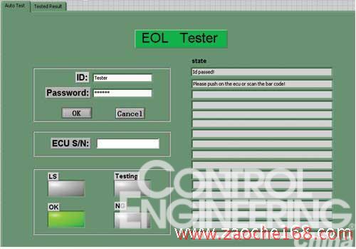 使用M系列NI PXI-6251数据采集板卡的一个模拟输出通道模拟8个车载传感器(此模块为KONKA AE06 0III系统)状态,对 ECM 模块 A/D 部分的悬空、对地短路、高电平和中电平进行测试。将模拟输出值与ECM通过K-Line通信值比较,如误差在标定的许可范围内,则判定此部分电路质量合格。测试结果存入数据库,以文字方式显示在屏幕上,方便操作人员识别;同时,在后台显示测量数据,方便现场工程师调阅。